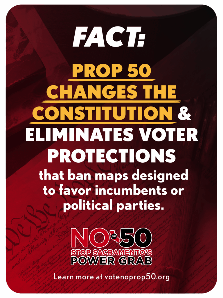Prop 50 would strip the California Citizens Redistricting Commission of its authority and give self-interested politicians the power to draw their own districts. This would take away fairness, transparency, and accountability from our elections. Stand up for voter-approved reform and fair